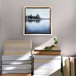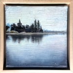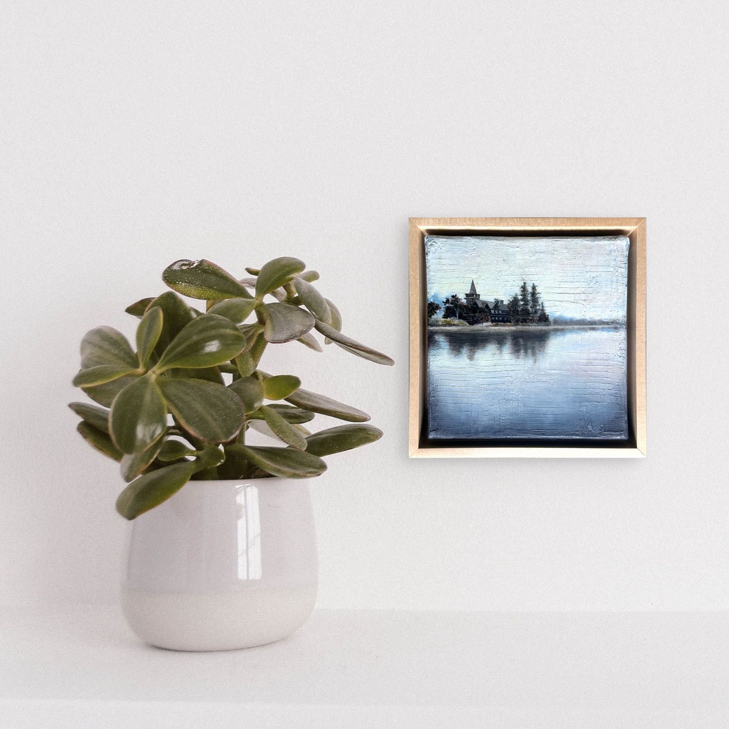 Lakeside at daybreak, the church emerged from the fog on a misty morning. The town was peaceful, and my thoughts, the lapping water on the shoreline, and the loons were all I could hear. This small 6x6" canvas is an oil on textured surface. Framed in a natural wood float frame with outer dimensions of 6.5x6.5", this piece comes with hardware attached and ready to hang.