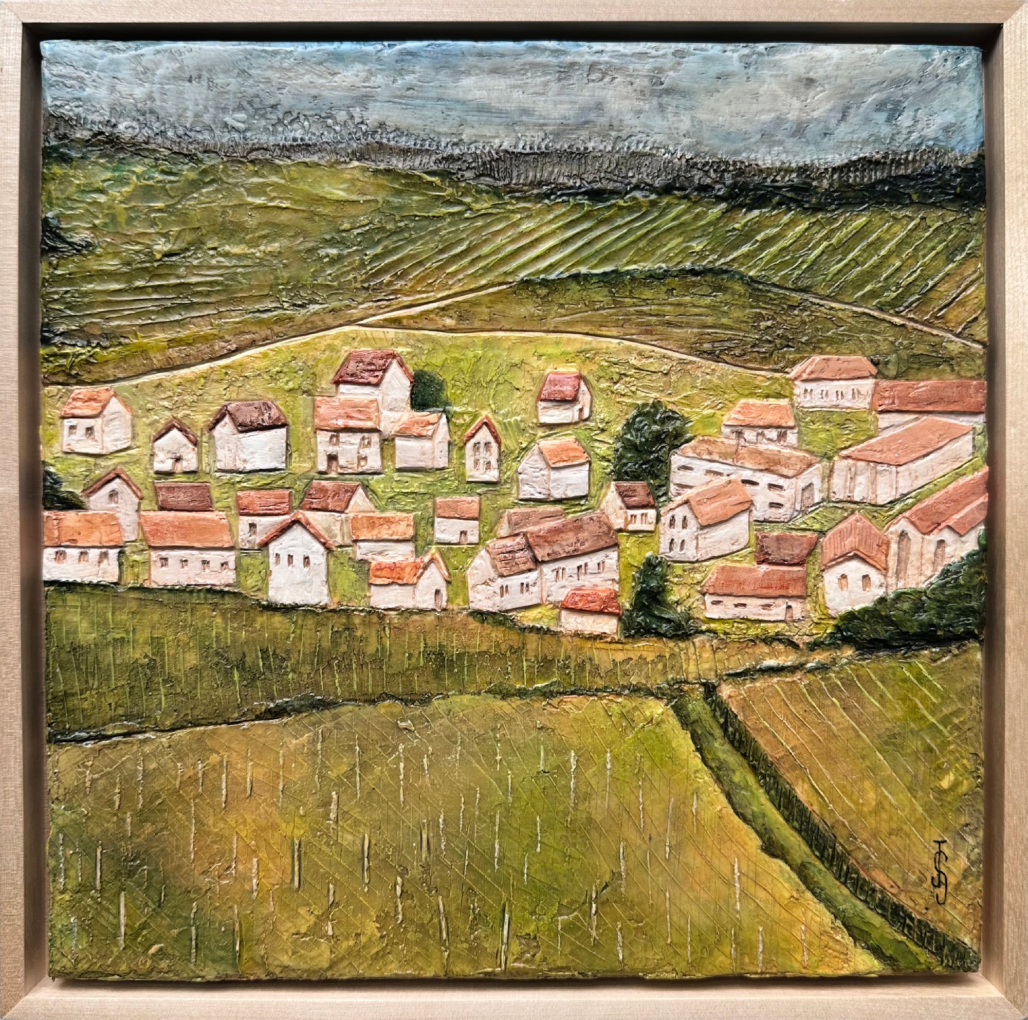 Traveling through the Champagne region of France, I stopped to overlook the vineyards and village of Cramant. The Vineyards in early spring, contrasting the white and terracotta colors and old-world charm of the village, were the inspiration behind this piece. I'm drawn to the simplicity and imperfections that create a village like this. Vineyards of Cramant is created with a sculpted and carved surface with Acrylic paint and modeling pastes. Sold framed in a natural wood float frame with ready-to-hang hardware included.